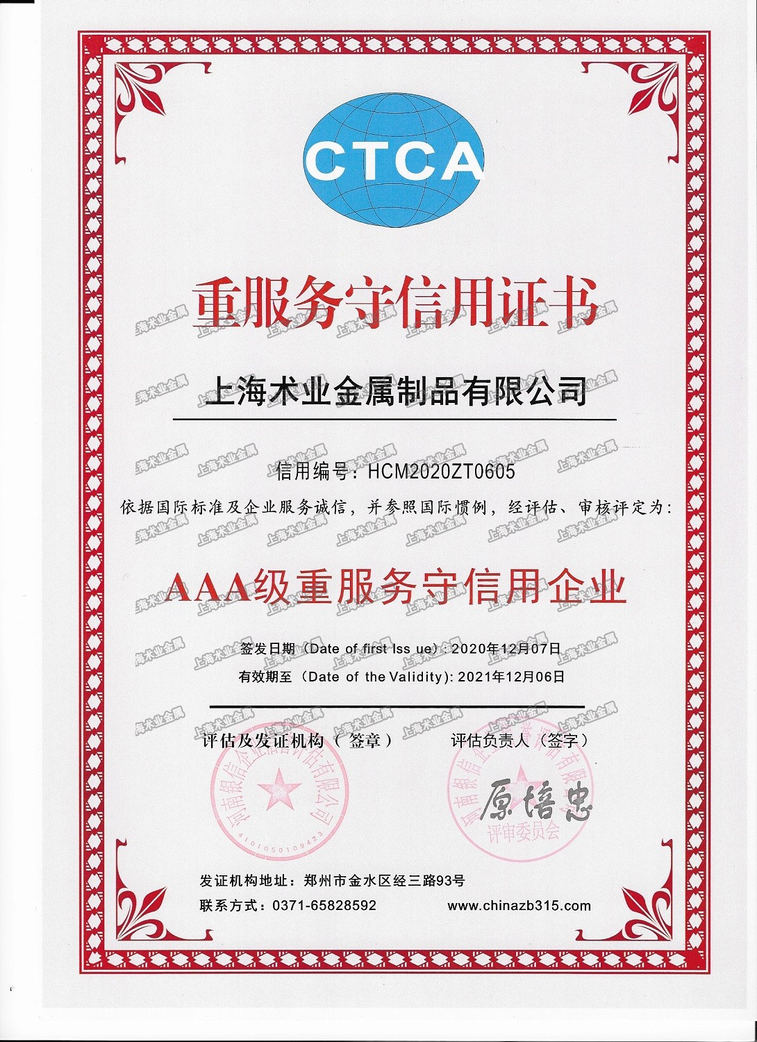 5.2020年12月7日,依據(jù)國際標(biāo)準(zhǔn)及企業(yè)服務(wù)誠信,并參照國際慣例,經(jīng)評估、審核評定上海術(shù)業(yè)金屬制品有限公司為AAA級重服務(wù)守信用企業(yè)(發(fā)證機(jī)構(gòu)地址:鄭州市金水區(qū)經(jīng)三路93號;信用編號:HCM2020ZT0605)