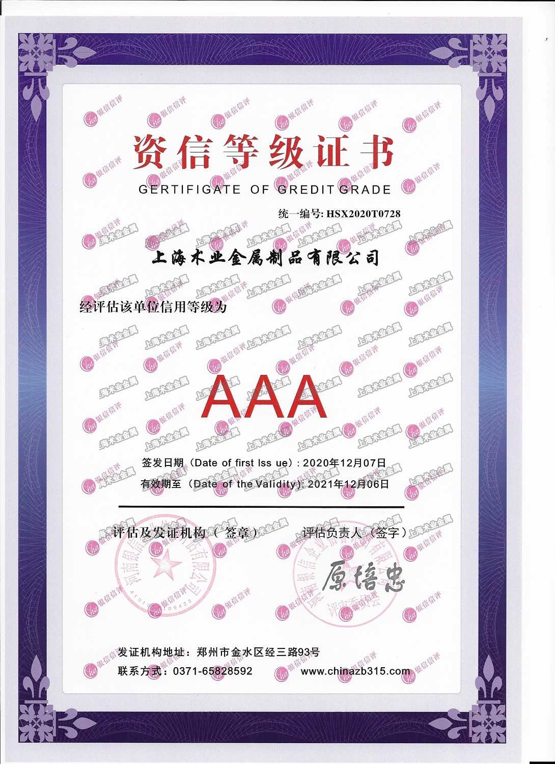 3.2020年12月7日,榮獲資信等級(jí)證書。上海術(shù)業(yè)金屬制品有限公司經(jīng)評(píng)估該單位信用等級(jí)為AAA(發(fā)證機(jī)構(gòu)地址:鄭州市金水區(qū)經(jīng)三路93號(hào);統(tǒng)一編號(hào): HSX2020T0728)